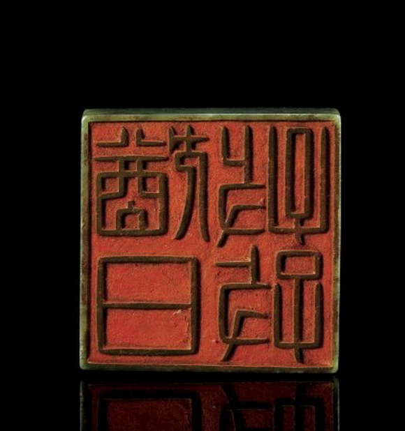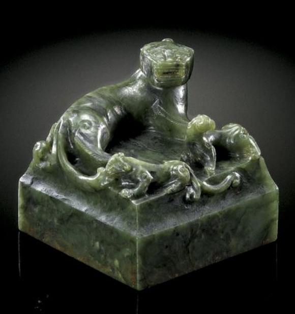 乾隆帝御宝三螭钮碧玉玺,印文:犹日孜孜;尺寸:7.3×7.3cm;创作年代:清乾隆;来源:北京寿皇殿;