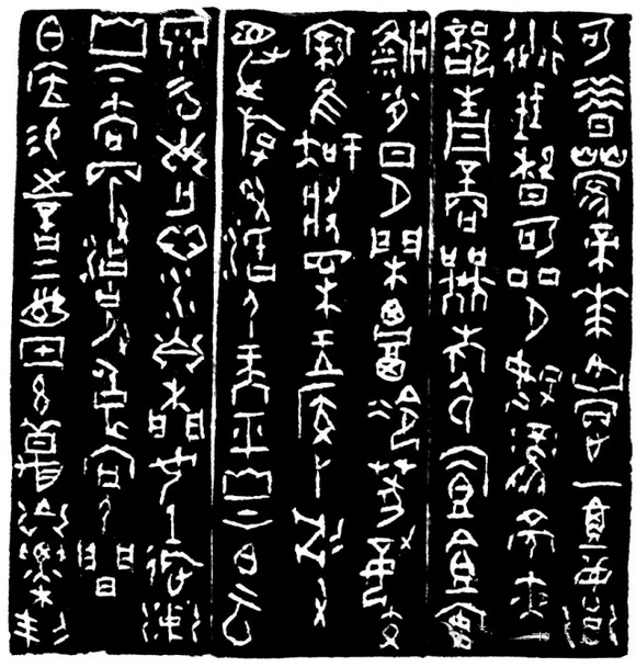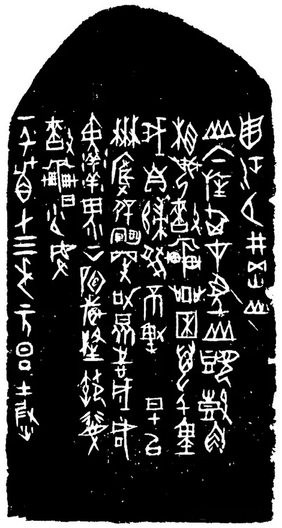 我刻甲骨文、小篆的边款与写字一样中锋用刀,中则藏锋敛锷,筋骨在中。圆线条可采用“披”“削”的刀法,直,要笔法刚健;曲,要血脉贯通。长线条可用“拉”的刀法,使之刻出的线条与小篆、甲骨文的气息相契合(也可以用冲刀的方法),甲骨文款以自由式章法,行与行之间有一定的距离,但每行与行之间都相互呼应,相互协调。秦士尉先生刻甲骨文边款也拟此章法(见图10)。