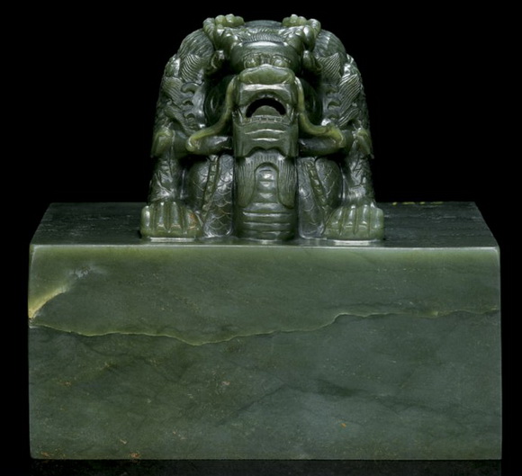 乾隆帝御宝交龙钮天恩八旬之宝和阗青玉玺,青玉质,交龙钮,尺寸:12.7×12.7cm,印面正方形,汉文篆书“天恩八旬之宝”六字,阳文。来源:北京寿皇殿,1990年。购自巴黎媚丽收藏。