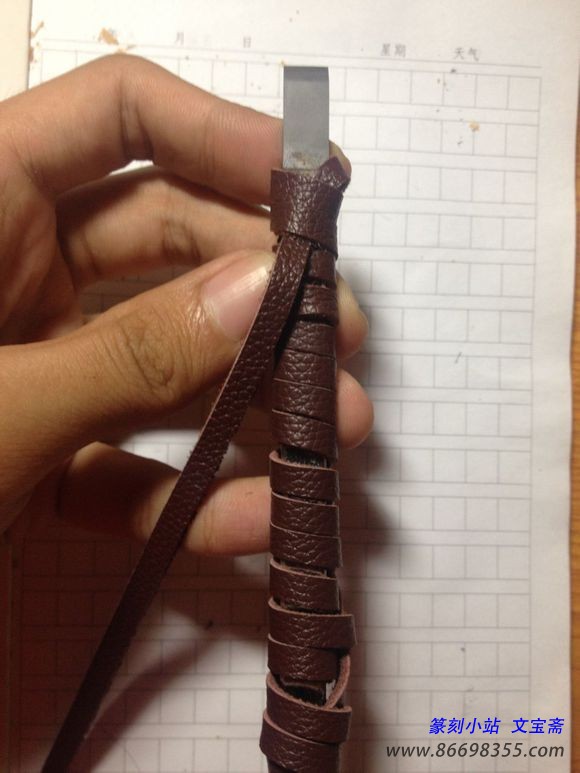 皮条一般还是选薄点儿的好,或者藤皮,可以细些,隔两圈一绕,这把刀刚缠起来嫌太厚,我看了下西泠的刀普通一般就插回来两圈收尾的,也还能看,就重新缠了下。