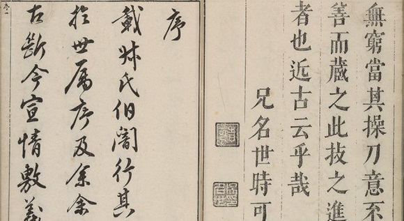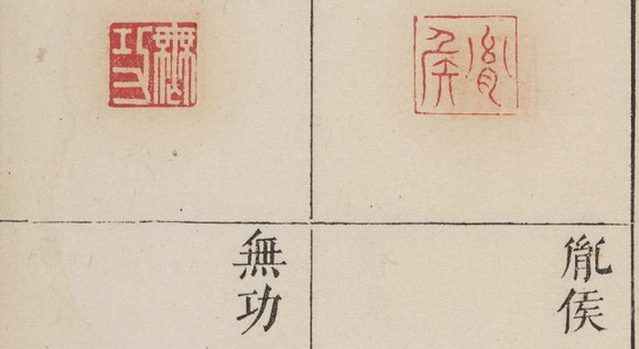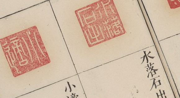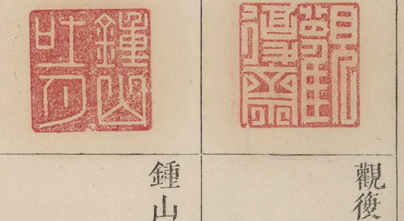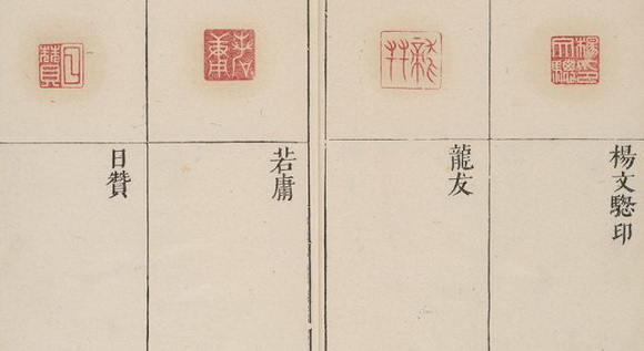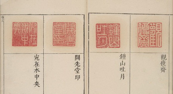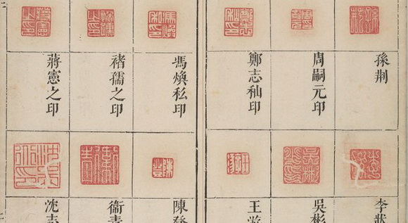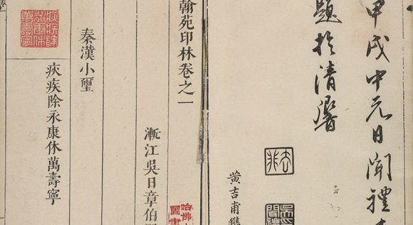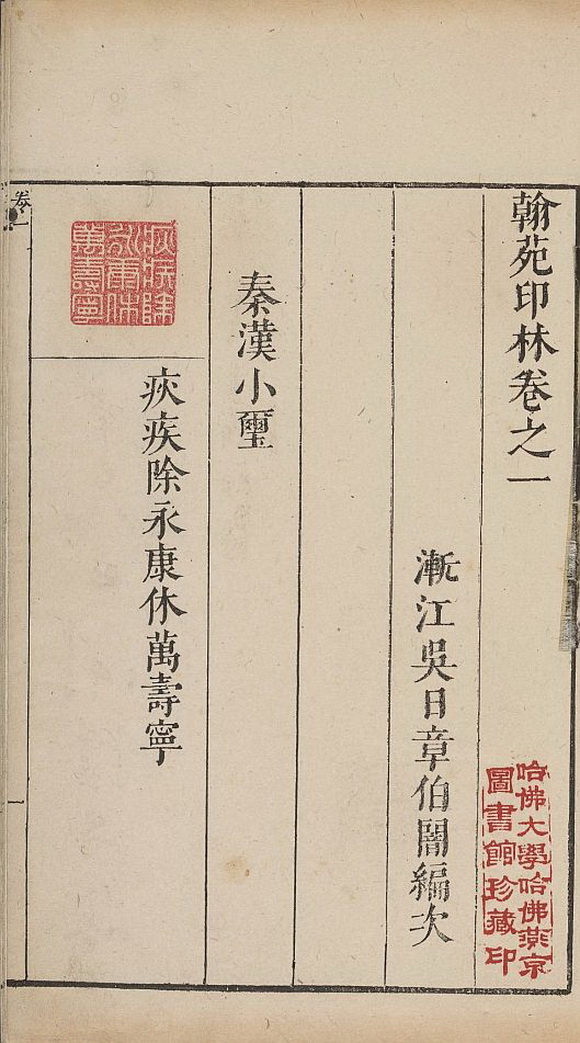 此《翰苑印林》由明代吴日章辑摹刻之印而成。全书共四卷,卷一录官印三十六方;卷二录私印(以百家姓编次);卷三、卷四为近代名人印。全书共计约474印,印下附有释文。此为明崇祯七年刊钤印本,前有吴明郊、吴名世,吴闻礼序。