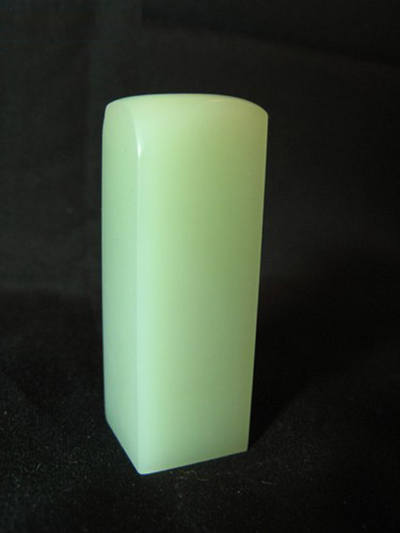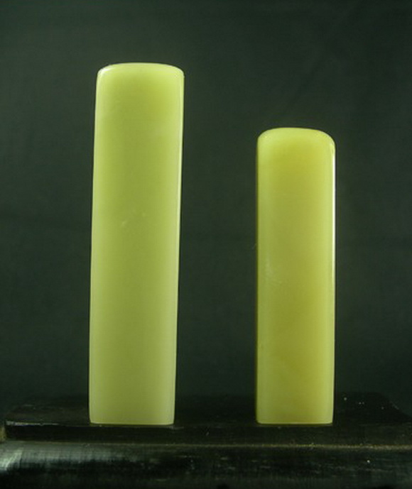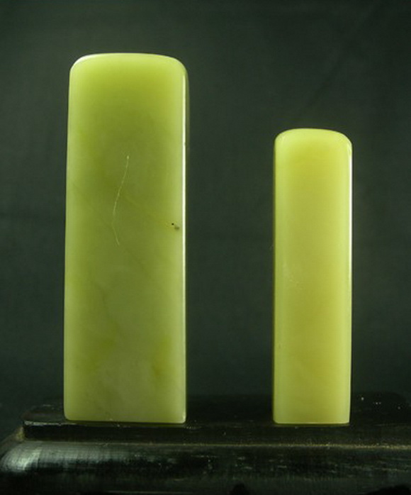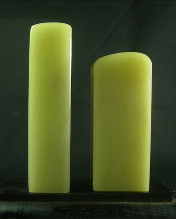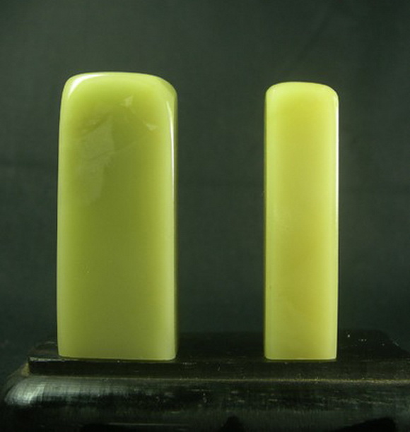 上面两张照片都是我手中的真品封门青,下面这张照片里的两方印章是白垟矿区出产的极品冻石,我们暂时称它为白垟冻,比较一下,看看他们是多么的相似