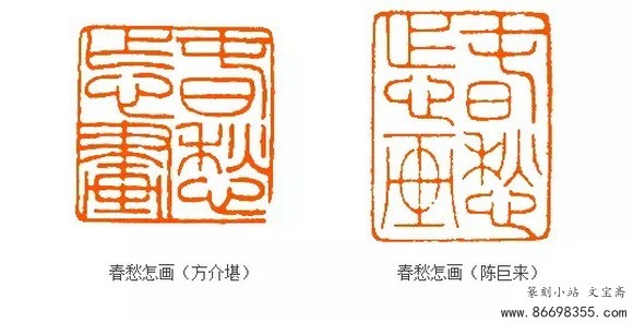 尤其有趣的是,同一印文的章,张大千经常会请两个名家来刻。比如“春愁怎画”这印文,张大千就让陈巨来与方介堪两人刻过,或许他看着这同门师兄弟争胜斗技、比拼印艺,觉得甚是有趣吧。