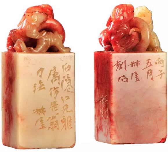 边款:1、丙子五月,叔厓刻石。2、石隐仁兄雅属,仿缶翁刀法,叔厓。