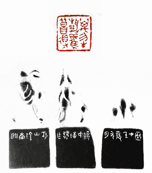 26 市中驴行 字体古拙、稚趣,线条自然有金石气,文义亦颇有趣味。旁款“市中驴行有 趣”也用了难读的古篆籀字,虽增加了整个作品的古意,也让一般老百姓感到了困难,最好再增加易读的真书注释。