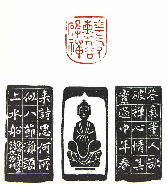28 花气熏人欲破禅 字体古雅,排列匀称散淡,笔划短促朴实,印面具有中庸和仙道之意味。旁款的佛造像和劲健的魏碑体说明更为整件作品增加了浓重的禅意和厚重感,可以说是一件很有特色的好作品。