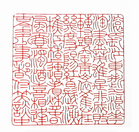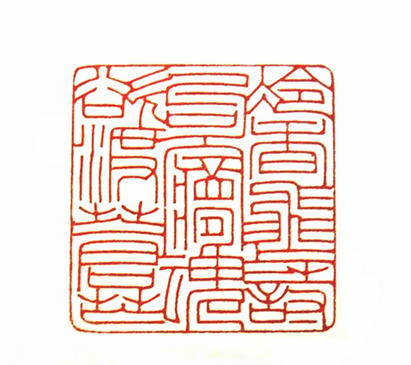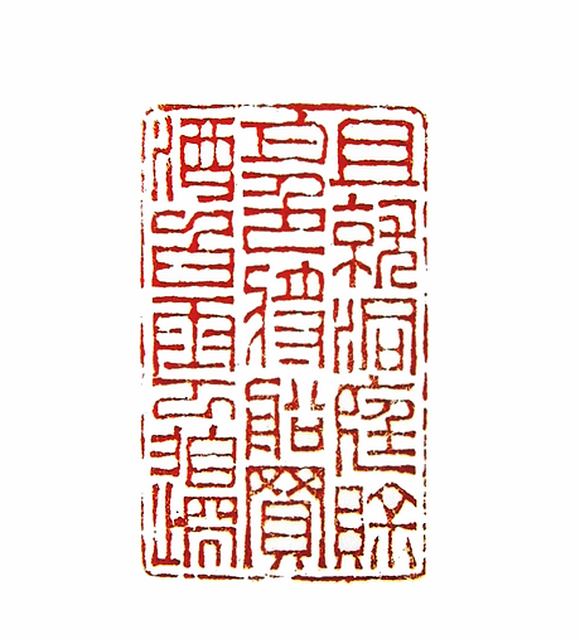 6,滚滚长江东逝水 浪花淘尽英雄 是非成败转头空 青山依旧在 几度夕阳红 白发渔樵江渚上 惯看秋月春风 一壶浊酒喜相逢 古今多少事 都付笑谈中 明代杨慎《临江仙·滚滚长江东逝水》全诗60字,分七列刻成正方印,字形雅致,笔划多圆弧线,字字之间无间隔而多有连缀,印面效果精美繁复有目不暇接之感,可以说是一件典型而精细至极、十分难得的元朱文印优秀作品。唯笔划中圆弧使用偏多,容易给人一些不够刚劲的感觉。