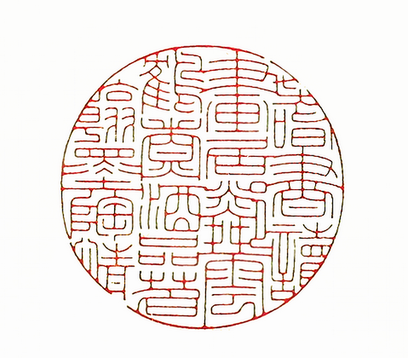 7,嗜书读画 居邻云鹤 煮酒品茗 翰墨陶情 16字分四列分布在一个圆内,结字娟秀,不随圆窗变化而是任圆窗切去一部分;笔划纤细多圆转,有些地方上拱;字间基本无间隙,有一些连缀,印面清秀儒雅,当属不错的元朱文印作品。