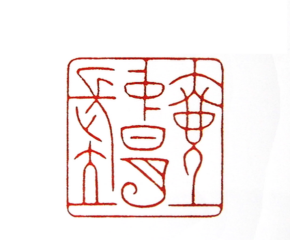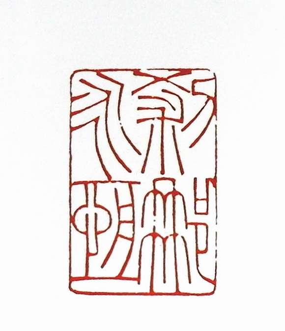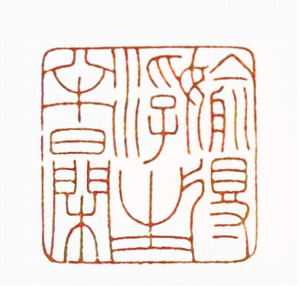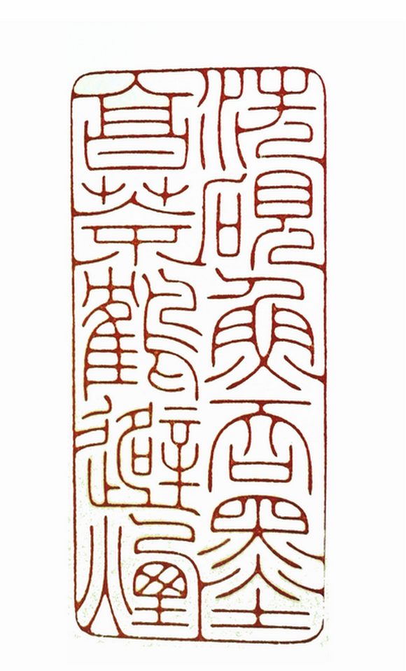 22, 壶中日月长 五字三列,左右各將壶长二字拉长,字体为变形的古篆体,笔划精细圆滑,印面效果有现代线条造型艺术的风格,生动而有趣味,是一枚颇有新意的精细朱文印好作品。