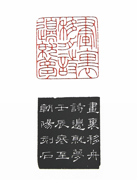 12, 画里移舟诗边就梦 8字三列正方形,笔划精细,多弧线,字间基本无间隙,也无连缀,印面整体有灵秀之气,隶书的旁款也很规整。