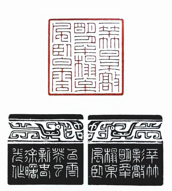 2,且就洞庭赊月色将船买酒白云边 十四字三列呈长方形,字形简朴方正,笔划横平竖直,间隔均匀,线条有明显的刀痕,印面效果古拙苍茫,是一件较好的作品。