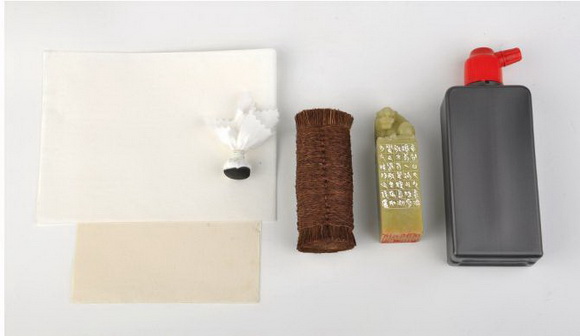 第一步:准备好拓边款工具(连史纸、拷贝纸、棕刷、印石、干净毛笔、白芨水或浆糊水、拓包、墨汁、毛边纸)