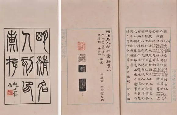 纵观先生所藏的这批印谱,可谓是包罗万象:旧拓本,新拓本,批注本,自辑本乃至影印本,兼收并蓄,琳琅如印林之锦囊;其收藏范围则几乎涵盖整个篆刻史的发展历程:明、清、民国,直至建国后的珍稀善本,名家名谱,无论古玺印谱还是流派印谱,很多都能在“槐荫层晖庐”的收藏中觅得踪迹,其中也不乏难得一见的孤本。