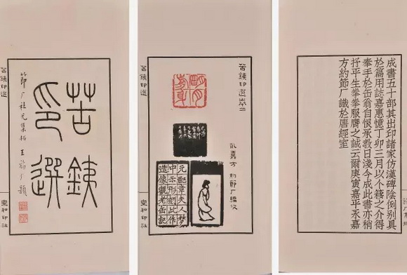 此谱为方节盦借得各家所藏吴昌硕刻印钤拓编成,凡四卷,计四册,由宣和印社刊行。版框墨线,书口署“苦铁印选”,下端另署“宣和印社”,背下又署“节盦集拓”字样。函套书签为沙孟海所题,四册书签分别由吴东迈、诸乐三、陈运彰及方去疾所署。卷首有王福厂篆书扉页,次则吴昌硕小像,方节盦自序,由序中可知此谱由方氏与高野侯、王福厂、唐醉石、葛书徵、王个簃、胡洤共同审定,由华镜泉、龚馥详钤拓,钤朱墨拓得五十部,其每页钤拓一印,同页拓有边款。共收印442方,边款526面。可谓规模宏富,制作精良,堪称吴昌硕最佳印谱之一。