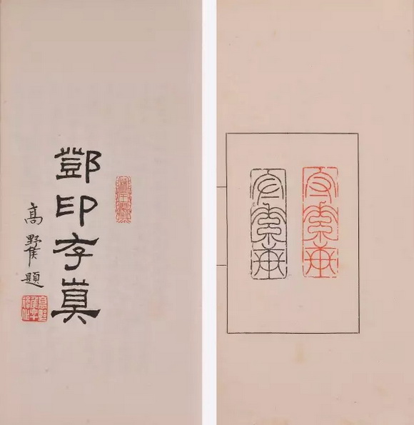 邓石如刻印集成,附其子邓传密刻印。系平湖葛昌楹以自藏及假自诸家所藏邓印原刻集拓而成,共二册。黑线格,每印印面有朱钤及墨拓各一,拓有边款,每页一印,均极精谨。计收录十三石,十五印。高络园题签,高野侯、张名珂序,葛昌楹跋。