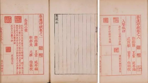 《秦汉印统》是继顾氏《集古印谱》之后又一明刊印谱。棉纸朱印,有太原王穉登、黄姬水序,集古印谱旧序,凡例。卷一末题:“万历岁丙午春王正月望日,新都吴氏树滋堂绣梓。新安程利见元龙、新安潘最茂卿同校。吴郡张佩之书刻”。卷八末镌“长洲龚善长刻”。《秦汉印统》完整者拍场甚为稀少,此本封面有手题签条,曾经王盈、郭尚先收藏,更可宝之。