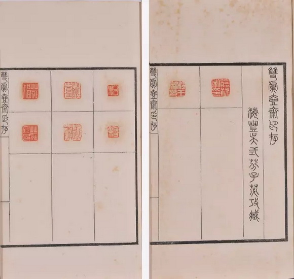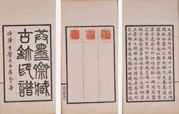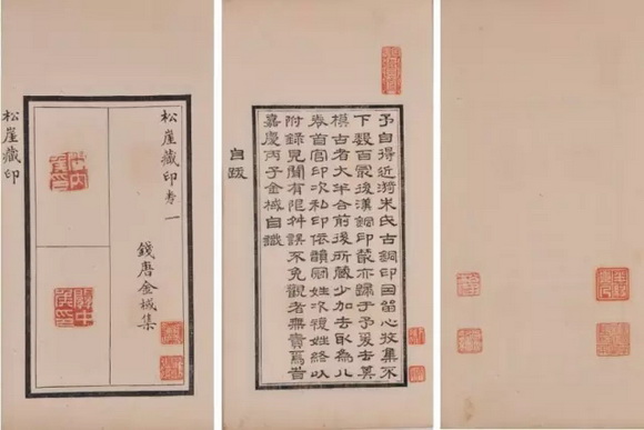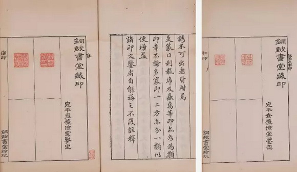 此谱为现代著名藏书家徐恕先生旧藏本。分别编为元、亨、利、贞四册,卷首有翁方纲、王文治序文。板框墨刷,书口上署“官印”或“私印”等,下署“铜鼓书堂珍玩”,总录古玺印824方。“铜鼓书堂”为查礼堂号,查礼卒后,其子查惇继续使用。