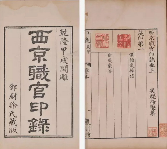 此谱出自清代著名书庄“书业德”,并曾经近代藏书家徐树铭及王靖廷收藏。书以《史记》将相名臣表和《汉书》功臣百官公卿表为依据,刻自韩信、萧何、张良、陈平等官职印五百多方。函套及首册封面题签均钤有“书业德自在江浙苏闽拣选古今书籍发兑印”朱文印,内页墨框,棉纸原钤,每印墨印释文。书口上署:“印录”,下署“怀新馆”,书名页署“乾隆甲戌开雕,邓尉徐氏藏版”,书前有徐坚自序、印笺说七则等,书末有“乾隆甲戌年冬邓尉徐氏开雕”朱印。书中有多处收藏印章。