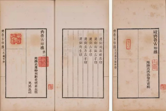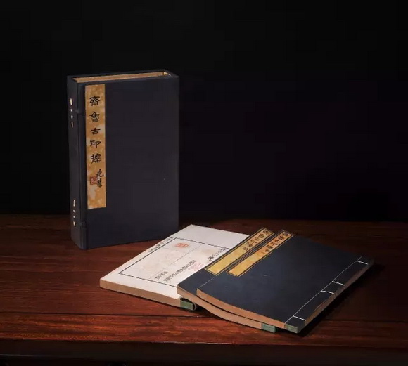 是谱一函五册,一至四册为《齐鲁古印攈》,高庆龄辑;第五册为《齐鲁古印攈续》,为高庆龄子高鸿裁所辑。谱中集录高氏所藏山东出土的三代秦汉古玺印六百余钮,再加续集所录一百六十余钮,可谓大观。书成于光绪九年,仅钤印十部,此其一。扉页题书名,有潘祖荫、王懿荣序及高庆龄自序,第四册有宋书升后序。内页墨框,书口上署“齐鲁古印攈”,背面下署“古雪书庄定本”。此本为任晓麓先生所藏,函套题签即为其手书。