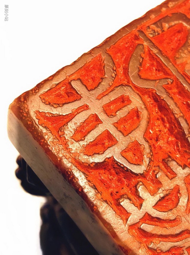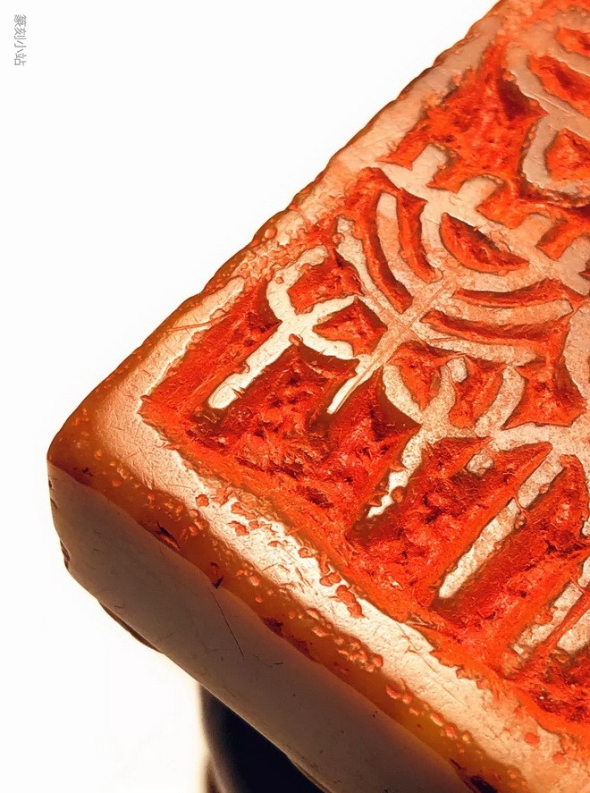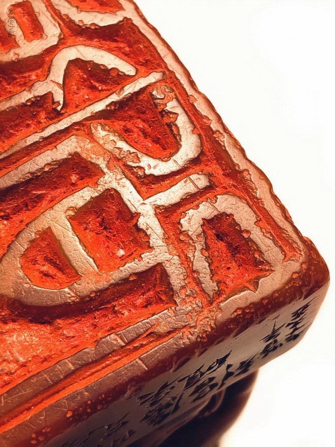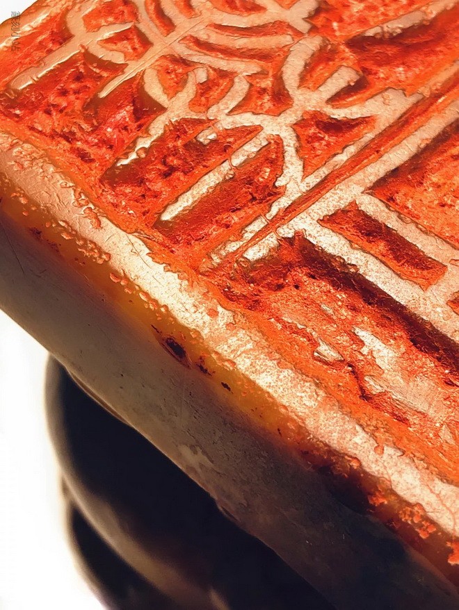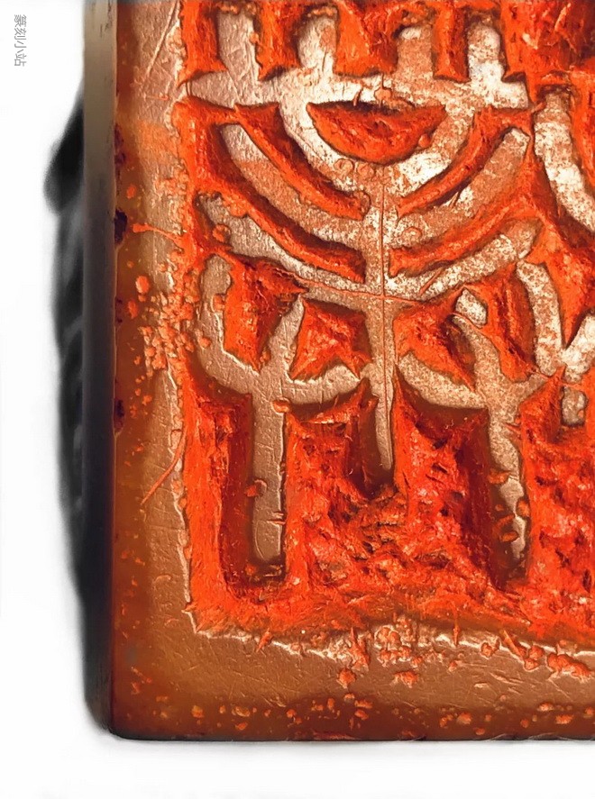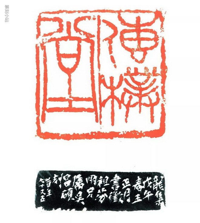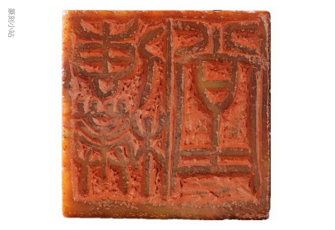从篆刻风格上看,更堪称吴氏作品的典型:篆书朴茂雄浑中不乏灵动变化,用刀大胆泼辣中又饱含细腻的收拾,章法布局则注重虚实对比及空间感的营造,最后再辅以粗厚的边框和残点的营造,使得整印呈现出厚重与飘逸和谐共存的动人面貌,充满大气淋漓的艺术之美。
