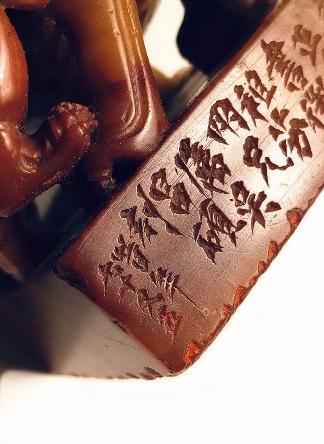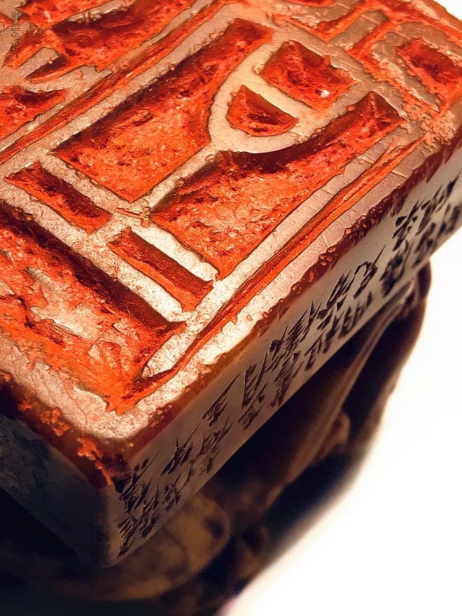 传朴堂”堂号印乃吴昌硕七十五岁(1918)受好友葛昌楹、葛昌枌兄弟嘱托所作。印文:传朴堂;边款:龙集戊午春王正月,书徵、祖芬两兄嘱吴昌硕刻,时年七十又五;此印为寿山高山石刻成,印钮雕太狮少狮戏球,印高11.2厘米,印面尺寸为6.4X6.4厘米,尺寸之大,在吴昌硕的传世作品中极其罕见。