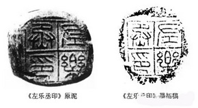 “封泥”的特殊性质要求字迹清楚,线条完整,便于识读和检验,以防假冒和泄密。白文印章增加界格后,横纵直线使抑压在泥面上的文字轮廓更为清晰,印面文字更为聚拢团结,同时也增加了仿冒作假的难度。我们可以通过现在的技术手段来把带有界格的“封泥印式”与去掉界格的印式进行一下对比(如图10、图11)图10为秦封泥《左乐丞印》的原泥和墨拓稿,图11为通过电脑技术手段在图10墨拓稿基础之上去除掉“田”字界格之后的效果,通过对比我们不难看出,去掉“田”字界格之后的封泥墨拓稿,显得空旷了很多,四字之间显得“各自为政”,字与字之间的联系骤然下降,与原稿相比清晰度也差了很多,秦代印章的严整秩序之美荡然无存,同时降低了辨别真伪的难度。当前,随着研究的不断深入,越来越多的秦印进入了人们的视线,但是我们所看到的绝大多数均为带有界格的阴文印,这可能和封泥之功用有着极其重要的关系。