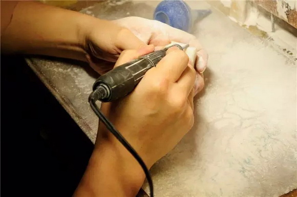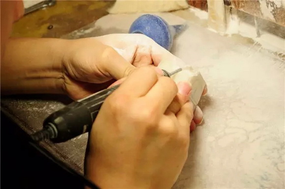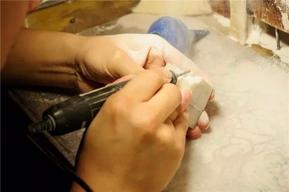开坯成型,开坯这个工序,在古代时都是纯手工的。用手凿之类的工具,不但速度慢,也不容易掌握效果。现代雕刻,大部分都使用镙机。但镙机雕刻粉尘很大,因此最好有专门的工作室和工作台,并且安排好通风吸尘的设备。