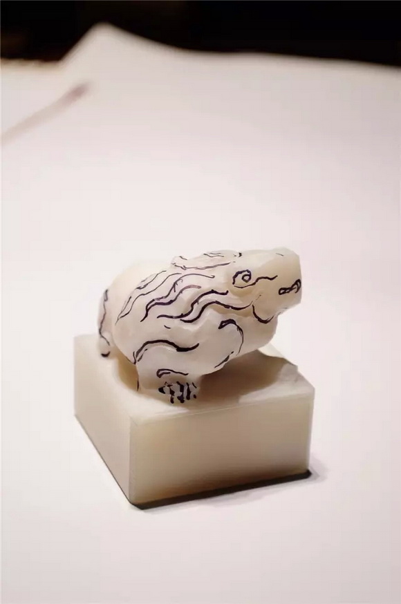 勾线描图,篆刻小站某大师在进行勾线的时候说,其实雕刻就像绘画一样,想要雕刻之前,要先打好框架。勾出古兽和印台的界限后,如果有不满意的地方,也可以反复擦掉修改。