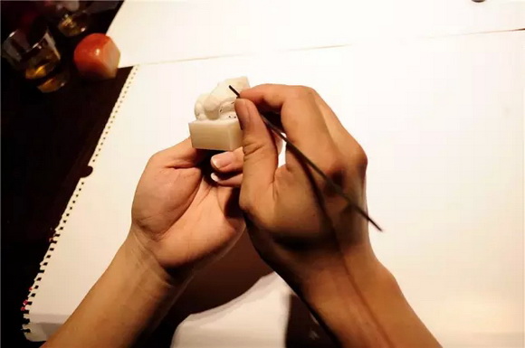 雕琢细节,印纽的形状基本已经完成,接下来就要开始细节刻画了!下手之前,还要再一次勾线,虽然熟练的雕刻师不走这一步,但新手一定不能怕麻烦,勾线之后就可以使用刻刀,按照线条慢慢刻下去。