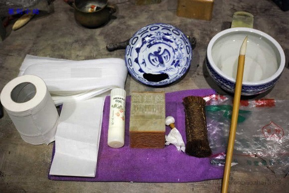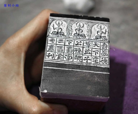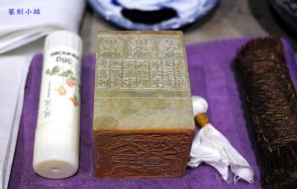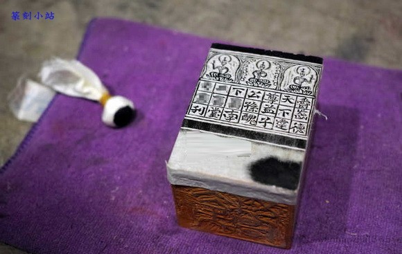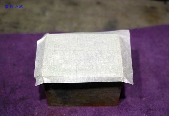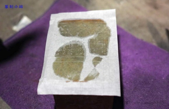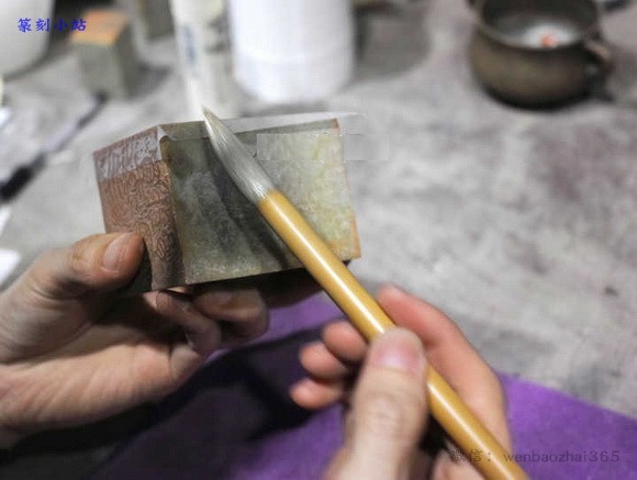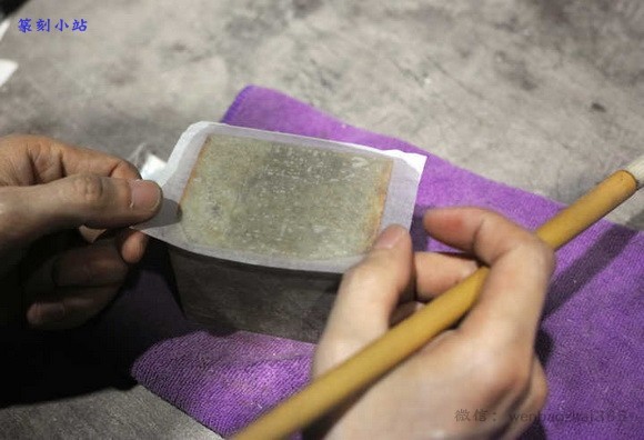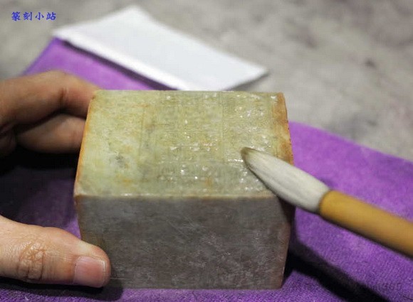 第三步:用毛笔沾清水先在印石边款上涂抹均匀。
