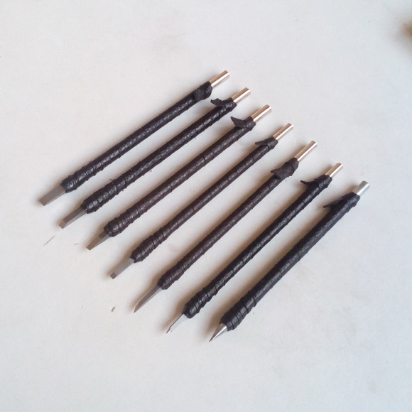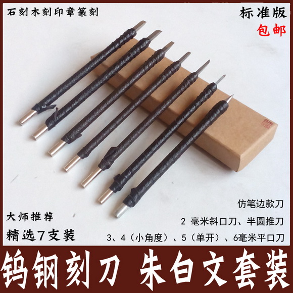 标准版钨钢篆刻刀雕刻刀7件套,刀头采用进口钨钢精磨锋利耐用,圆柄外缠皮防滑设计,适用于印面尺寸1.5-3.0厘米见方的印石章料,也可刻木、朔料、果核等,主刻字,有精修辅刀,可雕钮,能加工博意、博古效果,特别适合朱文、白文等印章的篆刻,现在订购送可卷起刻刀皮套!