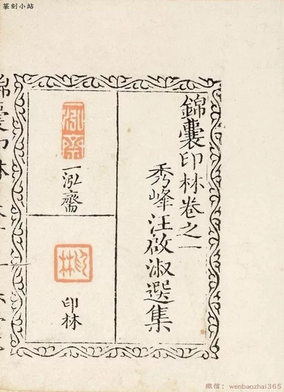 “卷草纹”是传统图案之一,多以忍冬、荷花、牡丹、荷花等花草为蓝本,以构成S形曲线之连续图案。“卷草纹”是由蔓生花草构成活泼饱满的纹饰,带有一种欢乐的气息,其连绵不断的造型特点,寓意连绵不绝、生生不息的美好愿望。《贺瑗印谱》 《锦囊印林》《林朗庵自用印谱》《试篆印存》均饰以“卷草纹”,使印谱版框带有流动的韵律感,美观且甚富抒情意味。