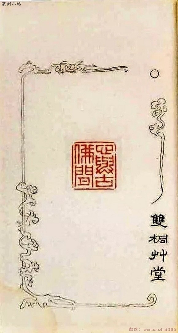 “祥云纹”是由卷曲线条组成对称的图案,线条舒展流畅,象征高升及如意。“祥云纹”形态多样,有十分抽象规则的几何图形,亦有生动形象之自然图形。在印谱中,利用“卷云纹”作为印谱版框纹饰者不少,《张一川集印集》《张寒月印谱》两谱版框以抽象形式的“祥云纹”作装饰,《龙喜吟墅印存》《双桐草堂印序》是写意的“祥云纹”,《春秋馆刻印》则用传统手法来描绘“祥云纹”。