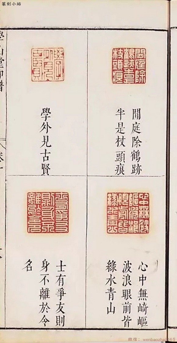 明代以至清初,印谱版框纹饰最初仍如古籍版框,只有简单的单栏或双栏形式,没有太大变化。自文人介入印坛,“文人”思维亦慢慢融入印坛,在印作中,其表现手法是以文言雅语或诗词入印,或以斋馆楼台及历史人物作为印文入印,此类现象,存世的明代印谱中比比皆是。
