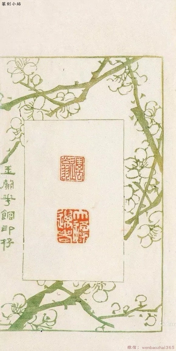 王安石《梅花》诗:墙角数枝梅,凌寒独自开。遥知不是雪,为有暗香来。又王冕《墨梅》图题诗:我家洗砚池边树,朵朵花开淡墨痕。不要人夸好颜色,只留清气满乾坤。梅花因有冲寒斗雪、清肌傲骨、孤高自赏精神,常被文人雅士用来寄托孤高傲岸的情怀和孤傲正直的性格。文人以梅花作为印谱版框纹饰,以表达胸中不为世人赏识之抑郁情绪。就以黄文瀚(翰卿)为例,其人赋性高傲,不肯屈就他人。爱竹,精刻印,晶玉竹木,无不擅长,又工诗词,广于交游,曾与友人共结诗歌团体白社和盟鸥吟社。其诗多写衰飒之景,寓凄凉之意,身世之悲与生活之穷困隐然可见。再以董熊为例,此为乌程(今湖州)人,晚年定居上海。原名如熊,字岐甫,号晓庵,一号小帆。他为人诚谨真率,无趋炎之态。善画梅花,工篆刻,每作一印必精心事之,嗜宗浙派,法赵之琛,庄重劲挺,工整稳实,著有《玉兰仙馆印谱》。上述二人均心性高傲,不肯屈就,不趋炎附势,而他们所编辑的印谱,版框均以“梅花纹”作为版框纹饰,正是他们性格和精神的写照。
