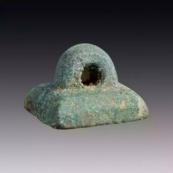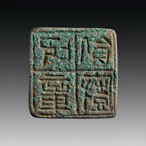 近日,从朋友那新获古印一枚,据云出于渭河。半环状鼻钮,印墙上有收分,近钮处呈坛台状。印长二十一点八、宽二十一点四、高十五点二、内孔径六点零、钮宽十点零毫米。古印锈迹緑褐参差,品相上佳。印文为右起“卬章飤厨”四字,带有边栏及十字界格。