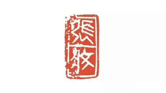 此印“日”字格上大下小,“张”字“弓”部的横笔斜行,弧线与斜线的合理运用使整方印于平正中见生动,“张”字右边“长”部四横的舒展,与“土”字的横扁之势相协调。在疏密的安排上,“张”的简洁处理,与“土”的下移,共同构成了中部的疏空。整方印加上边栏的不经意的处理,给人以率意自然而又宽博简远之感。