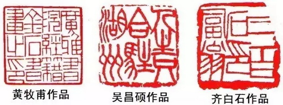 但是,边栏到底是印章印文的附属品,边栏的风格必须从属于印文的风格,这也是“会思考”的篆刻家必然会注意的。直到近现代,仍有一些钟爱文静典雅的篆刻家对印章边栏采取不残破或少残破的方法。黄牧甫不喜欢初期浙派笔画的“锯齿形”,说过大概意思的话:古人作印章,刚做好的时候线条肯定光滑的,为什么要效仿残烂后的效果呢?牧甫中、晚期印章作品笔画直爽凌厉,边栏也是不残或少残。王福庵、方介堪、韩登安等也有不少印章的边栏是工整的。当然,也有许多篆刻家印文取的是苍茫、雄浑的笔画线条,其中最突出的是吴昌硕、邓散木等等,相应的印章边栏也会苍茫、残烂。艺术风格的多样性导致了边栏风格的多样性,不单是不同的篆刻家会如此,同一个篆刻家的不同作品也会因印而异,工整与残烂完全应以印文风格为依归。