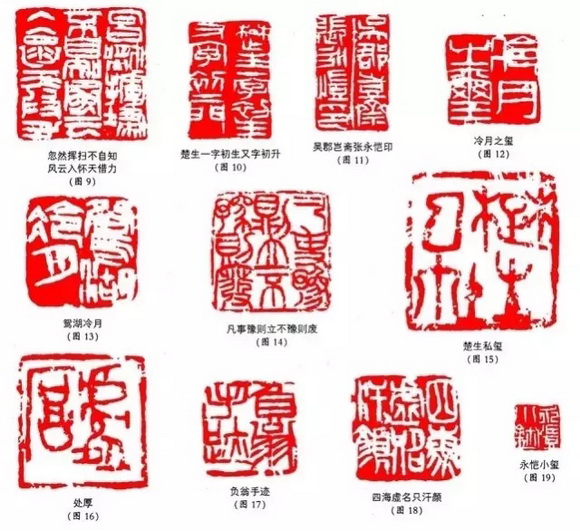 一般认为,刀法离做印法比较近。在具体刀刻的时候确实如此。强调刀法的称谓是太看重刻刀的工具性了。我们只是通过印花感受到印面的线条效果,并不能亲见作者操刀的具体动作。如果将刻刀的工具性和线条的艺术性结合起来,将刀法和线形线质对应起来可能就很好理解了。白文《冷月之玺》(图12)和《鸳湖冷月》(图13)的刀法是很不相同的。线条的粗细不是刀法的重点,线条的边缘才是我们要十分关注的。前印将凿印的线条形质很温润地表现出来,几处敲击的斑驳呼应,强化了在个层面上经历的共同岁月。印面形式内收;后印从铸印的浑厚中来,增强了线条的书写弹性,用大面积的并笔块面来渲染疏密对比,融人了更多的个人对线条的理解。如线条的中粗,藏锋敛锷。印面形式外放。来楚生向线下刀和刀刃刀角的敲击往往是结合起来使用的,为的是增加线条的丰富变化,突出虚实感。这一点比较集中地反映在朱文印式的创作中。朱文多字印《凡事豫则立不豫则废》(图14)的线条残缺处正是刀法修饰的结果,这个结果又是为章法的虚实统一服务的。多字印的刀法节奏相对平缓,少字印的刀法则相对激烈。意在通过线条的张力来充实章法的活力。如朱文古玺大印《楚生私玺》(图15)和《处厚》(图16)。此时的刀法和做印法往往已很难分辨了。我们要注意的是敲击的位置、敲击的力量、敲击的角度和敲击后的线形效果。同时,也要注意不能敲击的部位。如前印“生”和“玺”的底线和边线的结合部。“生”和“玺”的底线同样是和边线粘连,“生”字的底线左边抬起,以别于“玺”字“土”末笔的粘实。这是印面的视觉中心,你不能在这个地方动刀。敲击手法是个熟能生巧的过程,一般选择线条的中段、平行线、相同或相似的部件下手,因为这个地方的残缺基本不会影响到文字的释读。线条的交接处和角的破损要详察,要保留角的骨梗意趣。如“私”字的右上角,“处”字顶部的左上角等等。法需活用,法也要化用。
