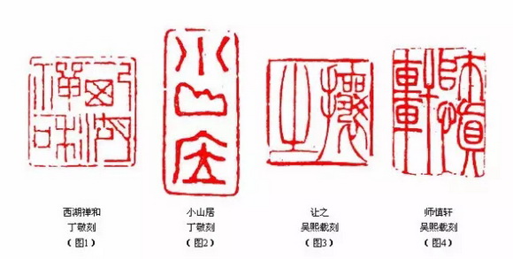 丁敬是“西泠八家”之首,作为开宗立派的人物,一生推崇“看到六朝唐宋妙,何曾墨守汉家文”。他的篆刻创作承前启后,一方面受朱简启发,将切刀广泛应用,流为一派,改变元明以来庸恶之习蔓延的创作;二是形式不拘一格,在创作中吸收应用唐宋印的妙处,尽管他的某些作品还存在不足。“西湖禅和”(图1)在结字上打破平正,章法疏密有致,极有新意。“小山居”(图2)在入印文字上也突破常规,已非“汉家文”,如今看来,确乎存在某种不足,但在当时确实有先见之明。
