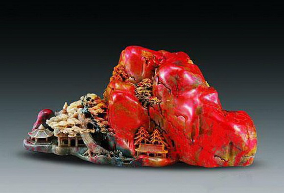 巴林鸡血石主要是高岭石和硬水铝石;而质地较为细腻的黑冻鸡血石和芙蓉冻鸡血石的主要矿物成分为地开石和辰砂;前些年在吉林某金矿之顶部发现有近似“金顶红”的脉石英致密块体,其中辰砂非常细小,质地坚硬细腻,也是硬地含辰砂石料,当地称朱砂玉。