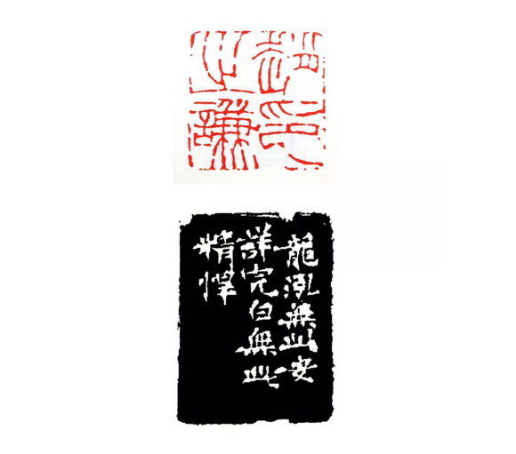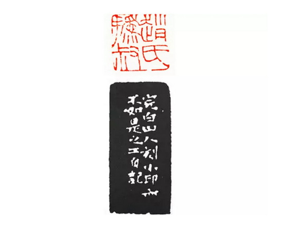 边款内容是,“龙泓(丁敬)无此安详,完白(邓石如)无此精悍”。也从这个时候,赵之谦对自己的浙皖印风已颇为自信,那两个创始人丁敬和邓石如的水平,他自认有些地方是超过他们了。浙派的丁敬没有他的印安详,皖派的邓石如没有他精悍,他明显的是集两家之长的。丁敬为啥没有他的安详,是因为过于追求刻,忽略了篆体书法的婉通与安静;邓石如为什么没有他精悍,因为过于追求书法的“写”意,而忽略了篆刻是“刻”出来的,需要刀痕。