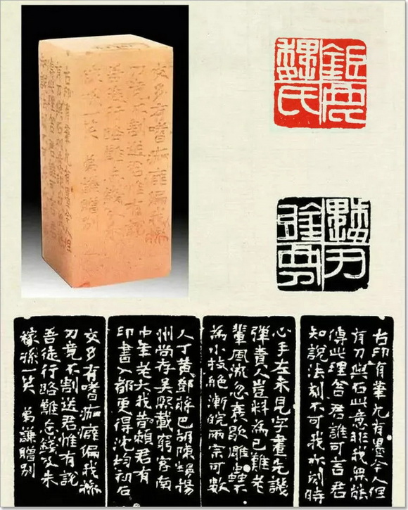 这次赵之谦干脆在边款里长篇大论地写了一首诗:“古印有笔尤有墨,今人但有刀与石。此意非我无人传,此理舍君谁可言。君知说法刻不可,我亦刻时心手左。未见字画先讥弹,责人岂料为己难。老辈风流忽衰歇,雕虫不为小技绝。浙皖两宗可数人,丁黄邓蒋巴胡陈。扬州尚存吴熙载,穷客南中年老大。我惜赖君有印书,入都更得沈均初。石交多有嗜痂癖,偏我操刀竟不割。送君惟有说吾徒,行路难忘钱及朱。”