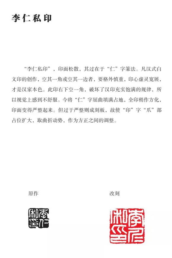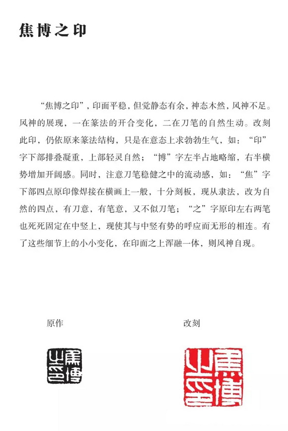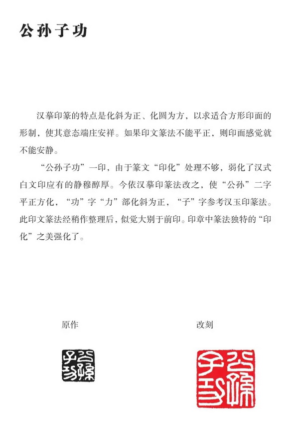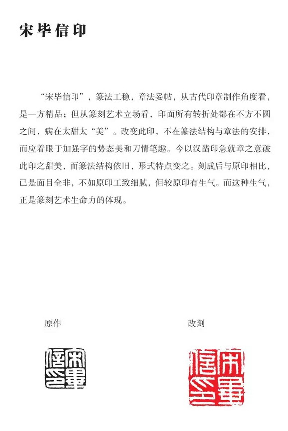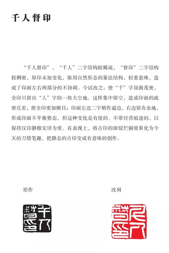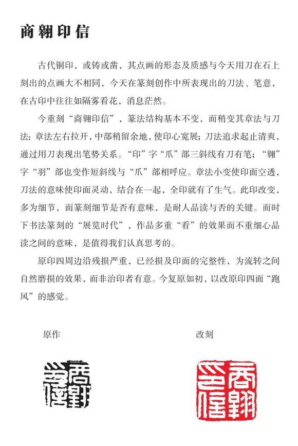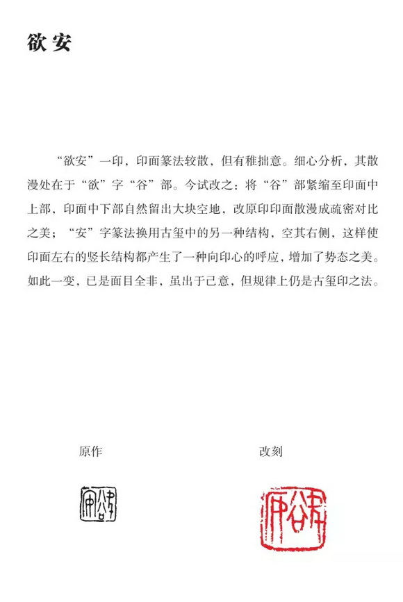 这本集子里,在传世的大批古代印章中,选出二百方认为值得讨论的印例, 一一进行评说改刻,沿用了邓散木先生当年的思路,运用批评的手段,从正反两面去说明篆刻美的规律,目的是使初学篆刻的人,对古印知其然并知其所以然。读者可以借鉴此集中对古印分析研究、变化改造的方法,增强对篆刻艺术学习把握的主动性和独立意识,从一开始就注重锻炼学印者的艺术想象力和创造能力。随着时光的延伸,篆刻艺术在不断发展变化,今天这里所改刻的二百方古印,比80年前邓散木先生所改刻的古印增加了更多的创作成分,同时也表现出更多的主观色彩。比如,邓先生所修改临刻的古印,只注意到篆法轻重及章法变化,今天的改刻,则对篆法、章法的改变手法更为大胆,此外还特别注意到古印自然形成的斑驳烂铜意味与今天以刀刻石的不同, 要把铸铜凿金的线条质感转化为刀情石趣,并通过刀与石表现出笔意。