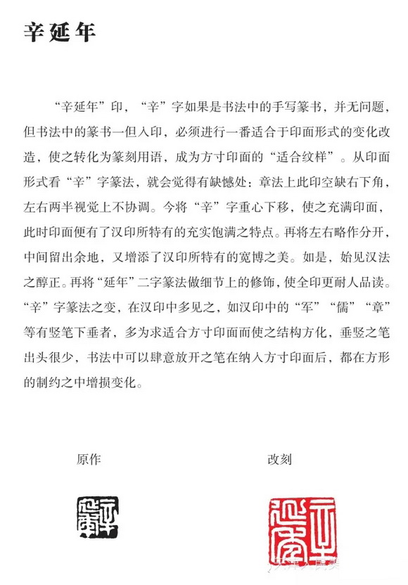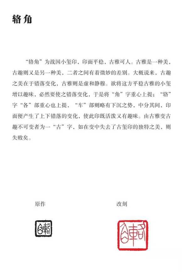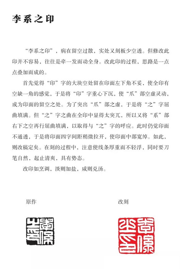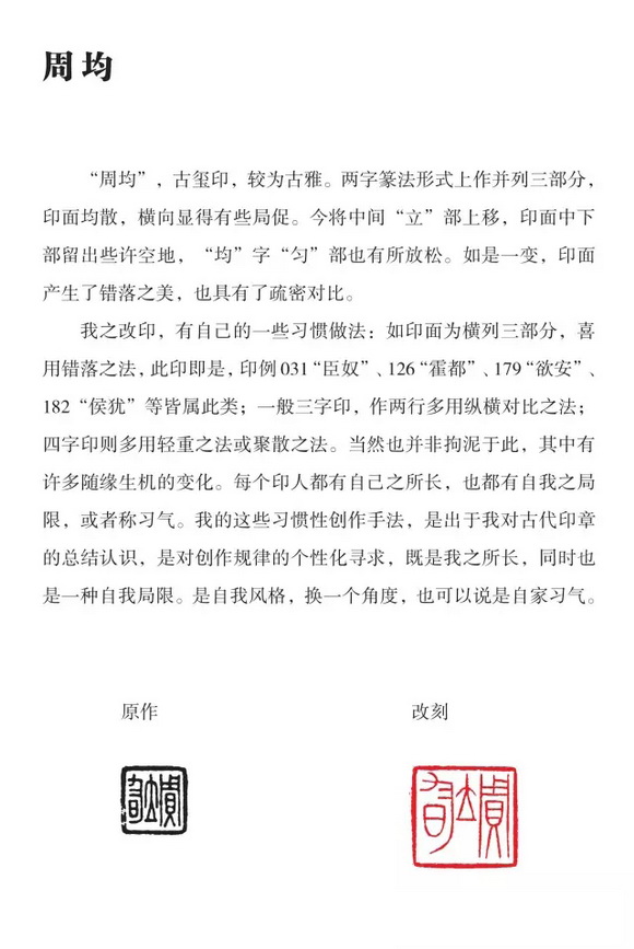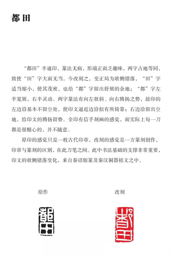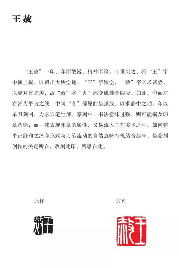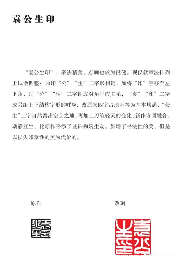 这本集子里,在传世的大批古代印章中,选出二百方认为值得讨论的印例, 一一进行评说改刻,沿用了邓散木先生当年的思路,运用批评的手段,从正反两面去说明篆刻美的规律,目的是使初学篆刻的人,对古印知其然并知其所以然。读者可以借鉴此集中对古印分析研究、变化改造的方法,增强对篆刻艺术学习把握的主动性和独立意识,从一开始就注重锻炼学印者的艺术想象力和创造能力。随着时光的延伸,篆刻艺术在不断发展变化,今天这里所改刻的二百方古印,比80年前邓散木先生所改刻的古印增加了更多的创作成分,同时也表现出更多的主观色彩。比如,邓先生所修改临刻的古印,只注意到篆法轻重及章法变化,今天的改刻,则对篆法、章法的改变手法更为大胆,此外还特别注意到古印自然形成的斑驳烂铜意味与今天以刀刻石的不同, 要把铸铜凿金的线条质感转化为刀情石趣,并通过刀与石表现出笔意。