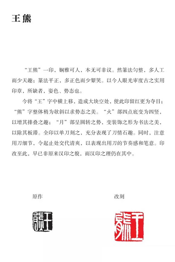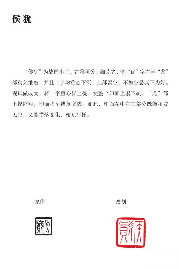 选印、分析、改刻的过程,其实是对古代篆刻再学习、再认识的过程。在阅读大量古印谱时,无数妙不可言的古代印章使我深深折服。当然,这个集子中所选印例不是择优而取,而是择其有评改价值的、站在今天篆刻艺术创作的立场上看不甚完美的作品。在选改的过程中,我深深地感到那些以天趣取胜的印,尽管有的在形式上存在“缺陷”,却是不可改动、不可再造的。自然醇古的战国玺印、错落生姿的秦印、奇肆率真的急就凿印,这些看来不甚精美的古印,恰恰是不可修改的,一但试图将其形式上变得完美,则天趣也将一去不返。混沌是自然天成的,试图给混沌凿窍,七窍成而混沌死!而可改的,是那些工艺性强、力求工致而有缺憾者,是那些有规律可循者,是那些以人工胜而不以天趣胜者。这一类印集中在汉印之中,汉印多为阴文,钤朱印于纸上则是白文,所以本集所选绝大多数为汉式白文印。