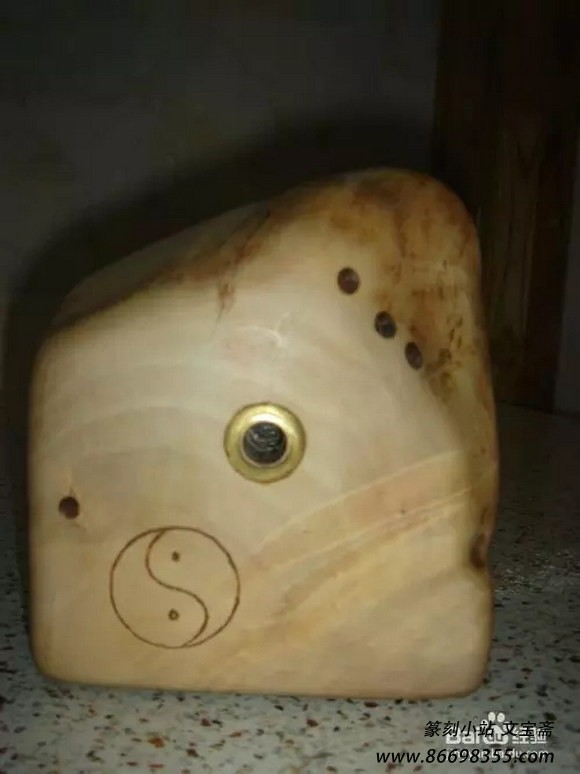 另一个镙母用制作辅件的方法安装到主体上,把2CM铜管用比它粗的尖状物冲出帽状(也可到车床处请技工加工一下),用锤子轻轻砸平如下图。至于印床上的太极图案和文字,如果你能熟练使用电磨的话,刻点东西出来是很容易的。