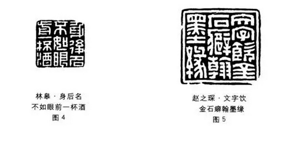 清赵之琛“文字饮金石癖翰墨缘”(图5),有行无列的章法为多字印带来丰富的变化组合,字形大小不一。印面竖向留红通畅,秩序井然。