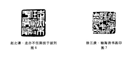 清徐三庚“袖海诗书画印”(图7),笔意表现过分,竖向留红缺失造成印面秩序混乱。