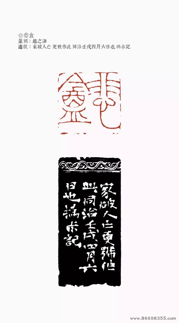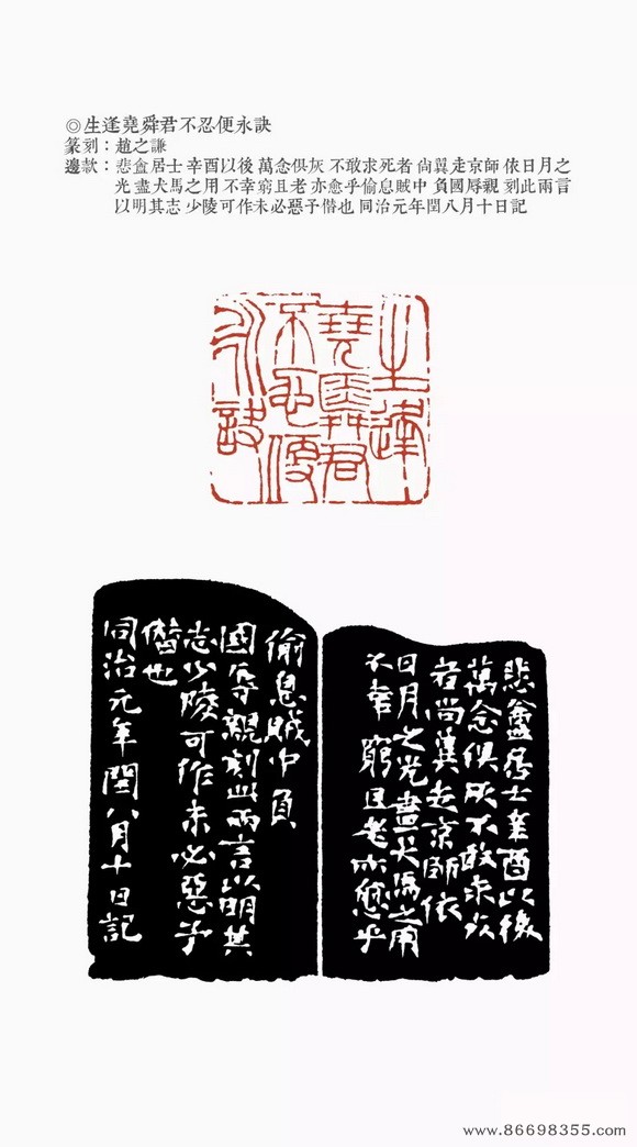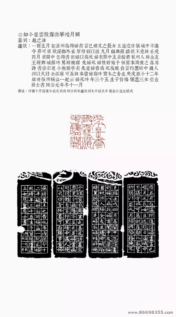 十一月,将《亡妇范敬玉事略》书于“俛仰未能弭浔念非但一”和“如今是云散䨮消华残月阙”两印侧(印面十月前后令钱式刻成,同治四年边款刻未半钱式卒,后由汪述盦续成)。